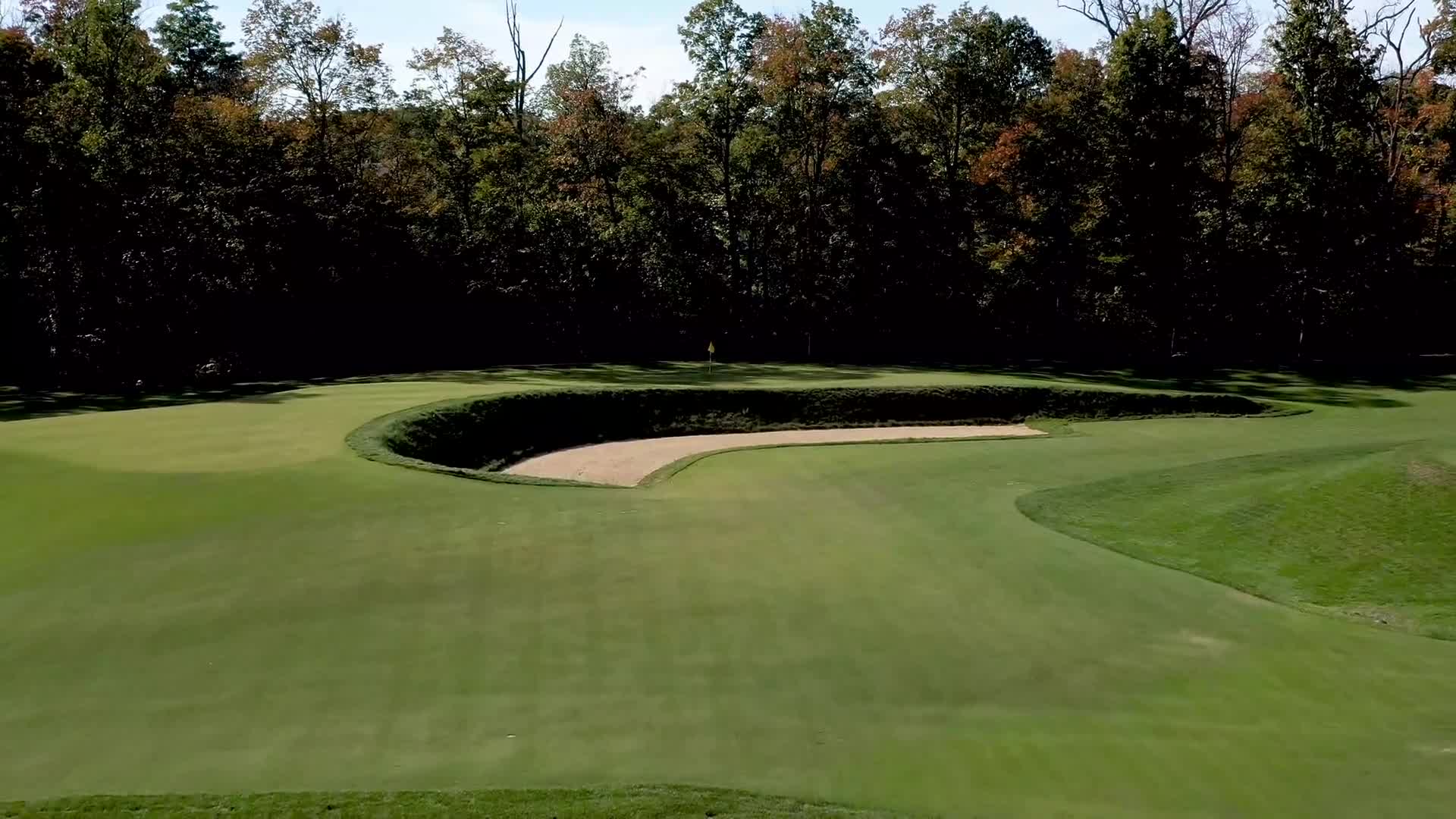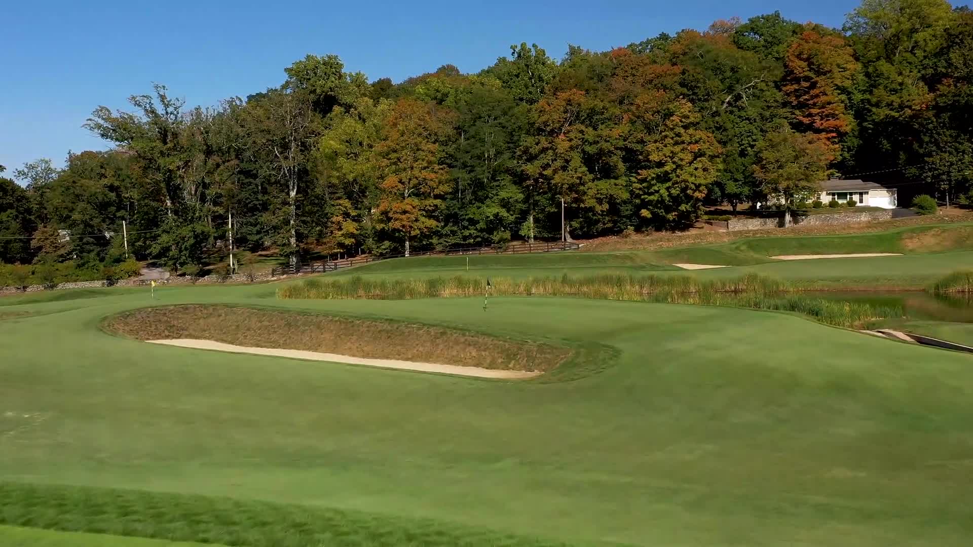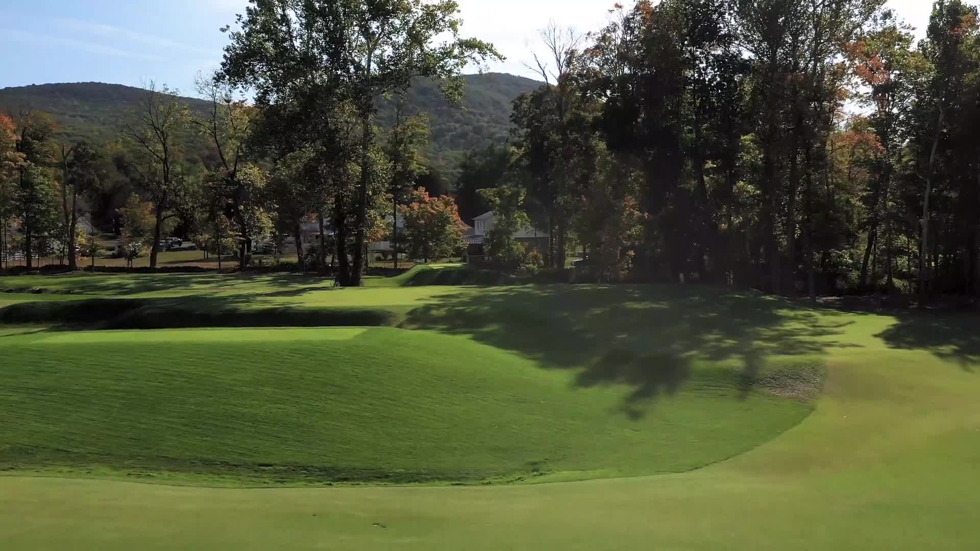 The climb is one of the original Storm King holes, revisited with a large double green with twin false fronts that provides an uphill 170-yard shot to a safe back pin or a fun 90-degree wedge shot from a much shorter tee location. The green is guarded by tall grass on two sides, a bunker that catches the errant shot left, and a friendly maple tree in back that is the safe aim point. As challenging as it looks, if you get a back pin placement, it is a clear birdie opportunity